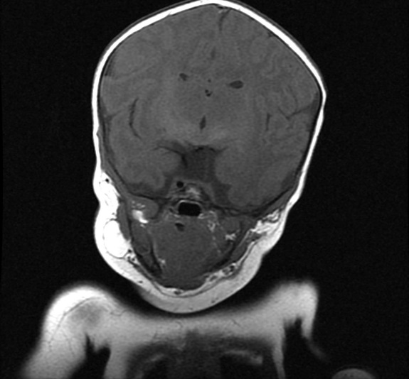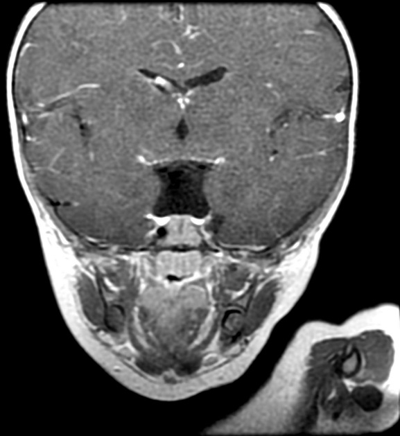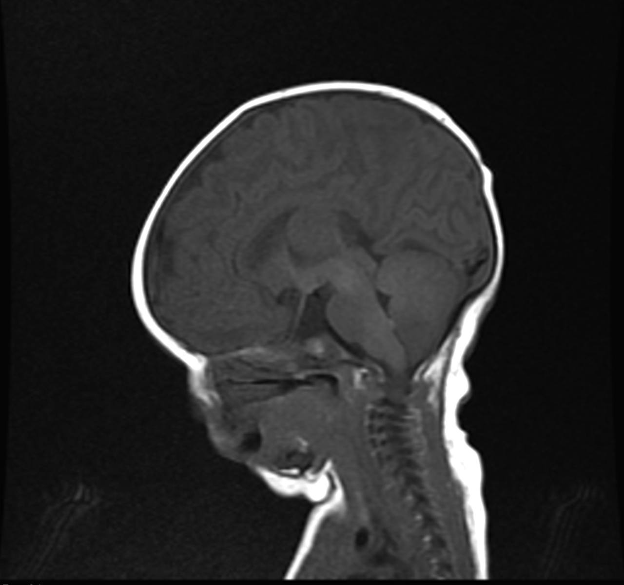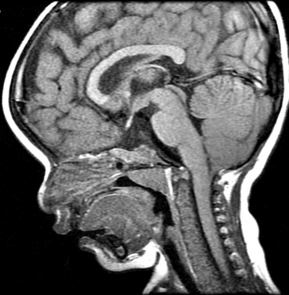 The patient is a 2-and-a-half-year-old kid. He was delivered by cesarean section after forty weeks of gestation. His baby's weight at birth was 2,800 g, and the length of his body was 49.0 cm. There was no consanguinity. He suffered generalized severe hypoglycemia and hypothyroidism on day 1 of life. Thereafter, he went on to be admitted to the NICU (Neonatal intensive care unit) for 1 month and 15 days. He was transported to our hospital for a medical checkup. An examination revealed dysmorphic traits such as frontal bossing, deep-seated eyes, low-set ears, a depressed nasal bridge, head lags, and micropenis. The patient had no pyriform aperture stenosis and no solitary maxillary central incisor (SMCI). Cardiac and fundal examinations were normal. He had generalized severe hypoglycemia and hypothyroidism on day 1 of life. Thereafter, he was admitted to NICU for 1 month and 15 days. He was also admitted for a diagnostic work-up and MRI brain to evaluate the pituitary gland.