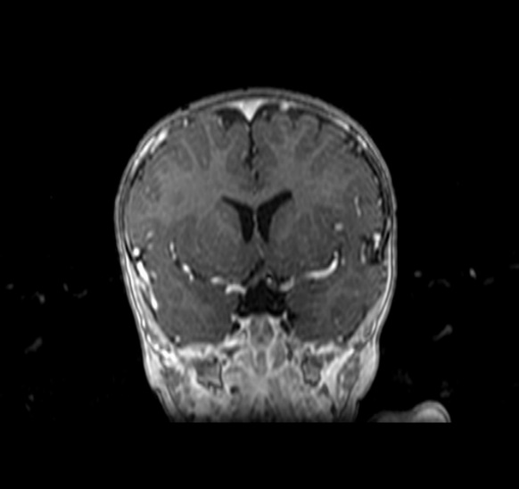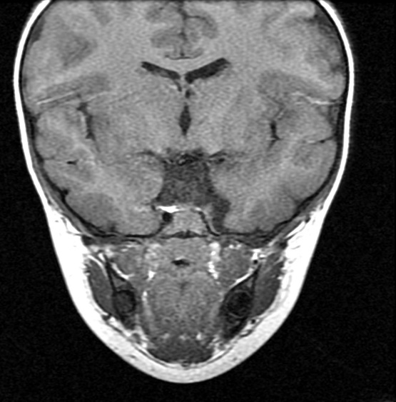 MRI findings showed the lack of the normal flow void of the left internal carotid canal and the first part of the left middle cerebral artery (Figures 1 and 2). The pituitary gland is flat. No evident anterior or posterior pituitary gland tissue or pituitary stalk is observed. The pituitary gland's strong posterior signal is not detected in situ or