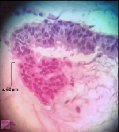 Figure 1. a) Haematoxylin and eosin stained section of skin (low power, 10X), showing mucin pools separated by fibrous septa along with embedded islands and cords of atypical cells. a. Section of fibrous septa separating mucin pools with embedded islands and cords of cells. b. A pool of extracellular mucin. b) A haematoxylin and eosin-stained section shows atypical cells with enlarged, hyperchromatic nuclei in a glandular pattern embedded in pools of extracellular mucin. a. Atypical cells with hyperchromatic nuclei. |